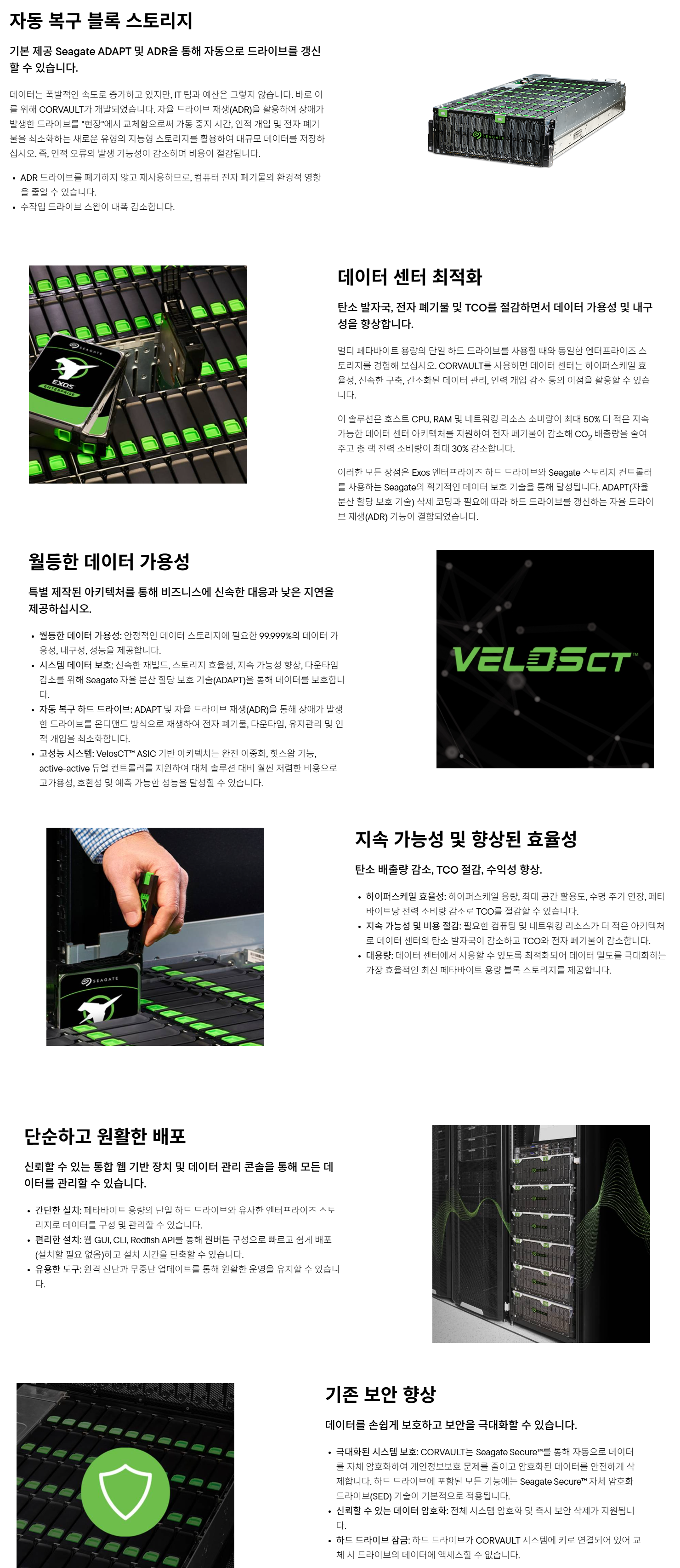 - 4U 랙마운트, 드라이브 슬롯 106개 - 컨트롤러: 이중화, 액티브-액티브, VelosCT 컨트롤러 - 최대 용량: 2.52PB - 관리 콘솔: 이중화, 액티브-액티브, VelosCT 컨트롤러 - 데이터 보호: ADAPT 및 지원되는 RAID 레벨: 0, 1, 5, 6, 10 - 듀얼 파워 2,000W