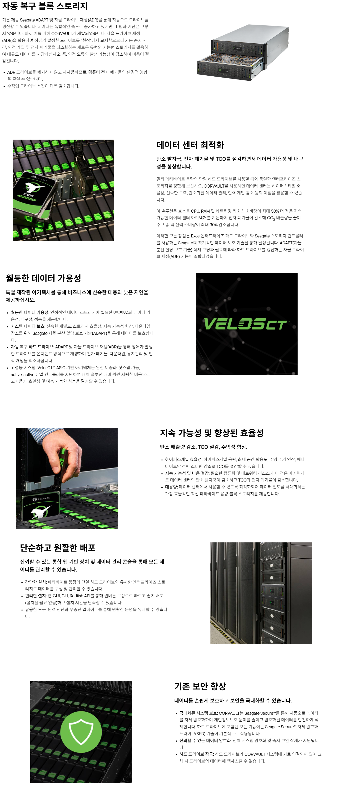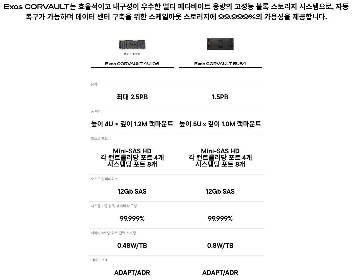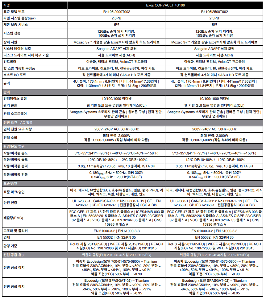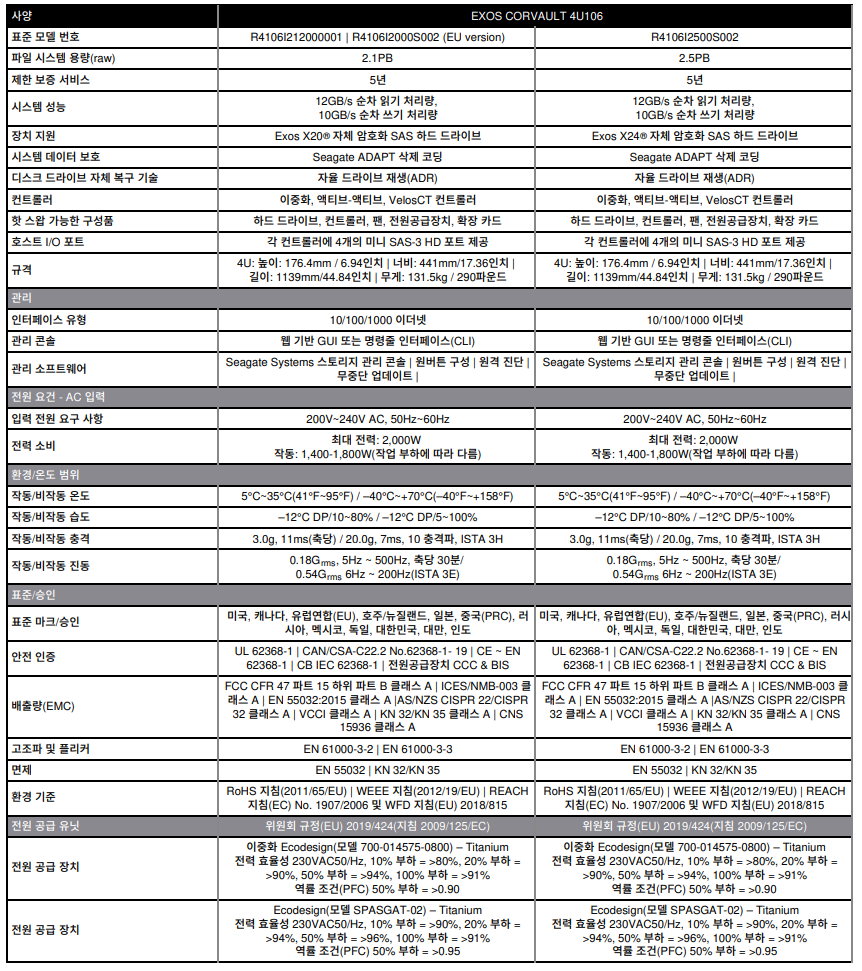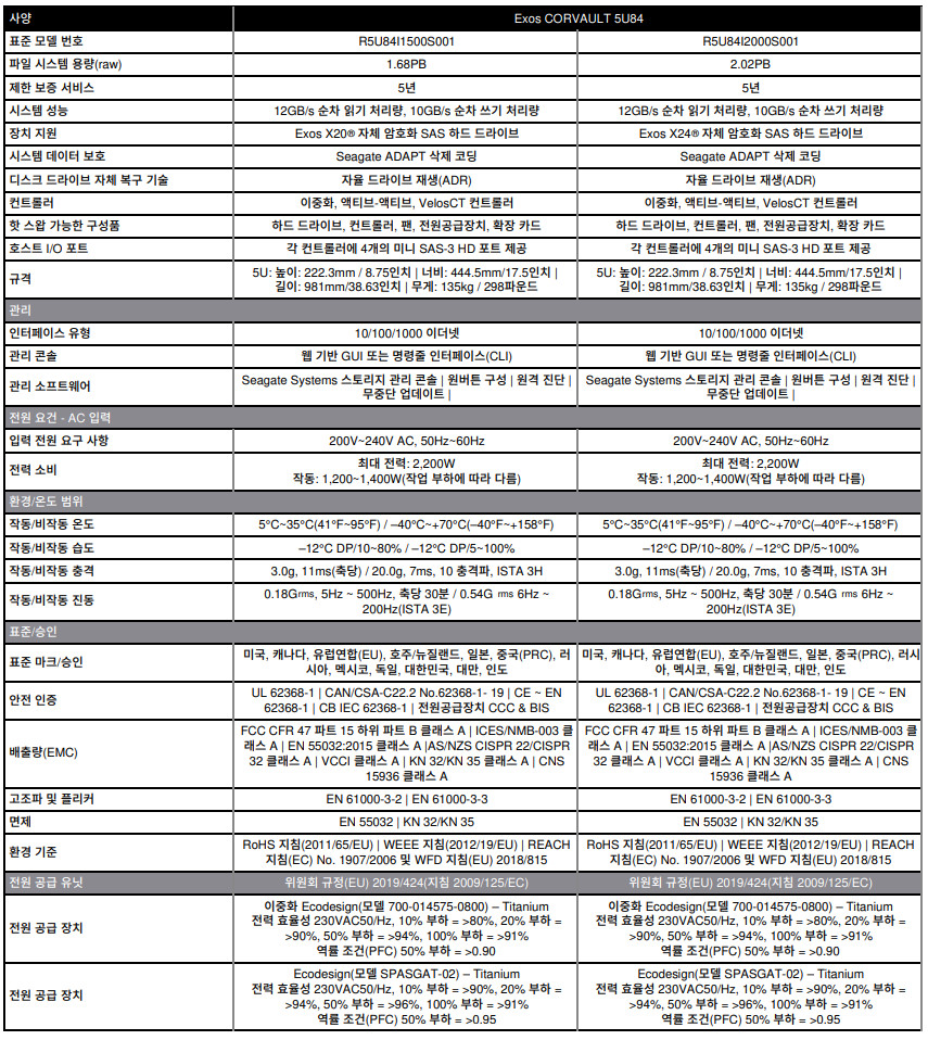 - 5U 랙마운트, 드라이브 슬롯 84개 - 컨트롤러: 이중화, 액티브-액티브, VelosCT 컨트롤러 - 최대 용량: 2.02PB - 관리 콘솔: 이중화, 액티브-액티브, VelosCT 컨트롤러 - 데이터 보호: ADAPT 및 지원되는 RAID 레벨: 0, 1, 5, 6, 10 - 듀얼 파워 2,200W